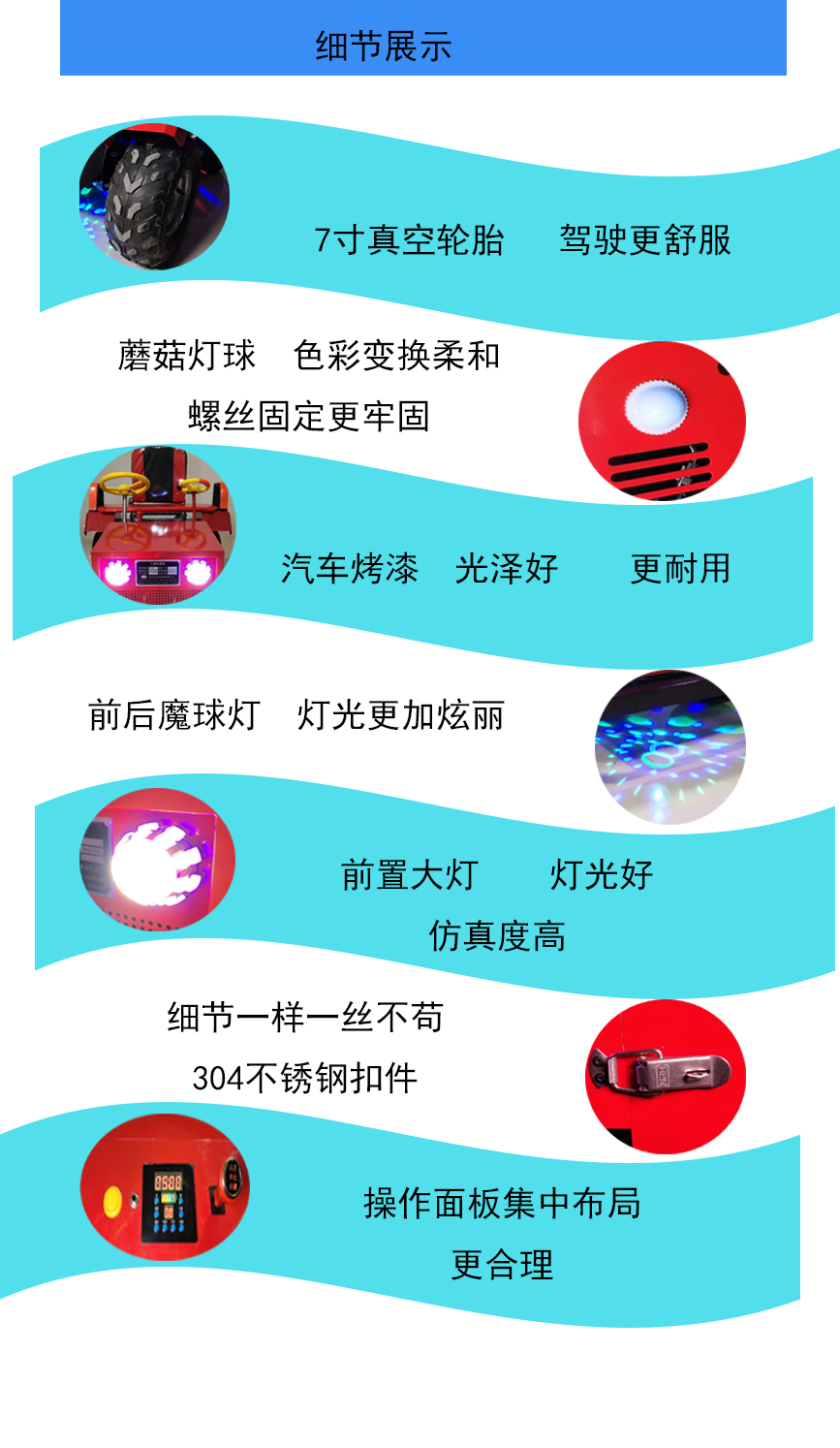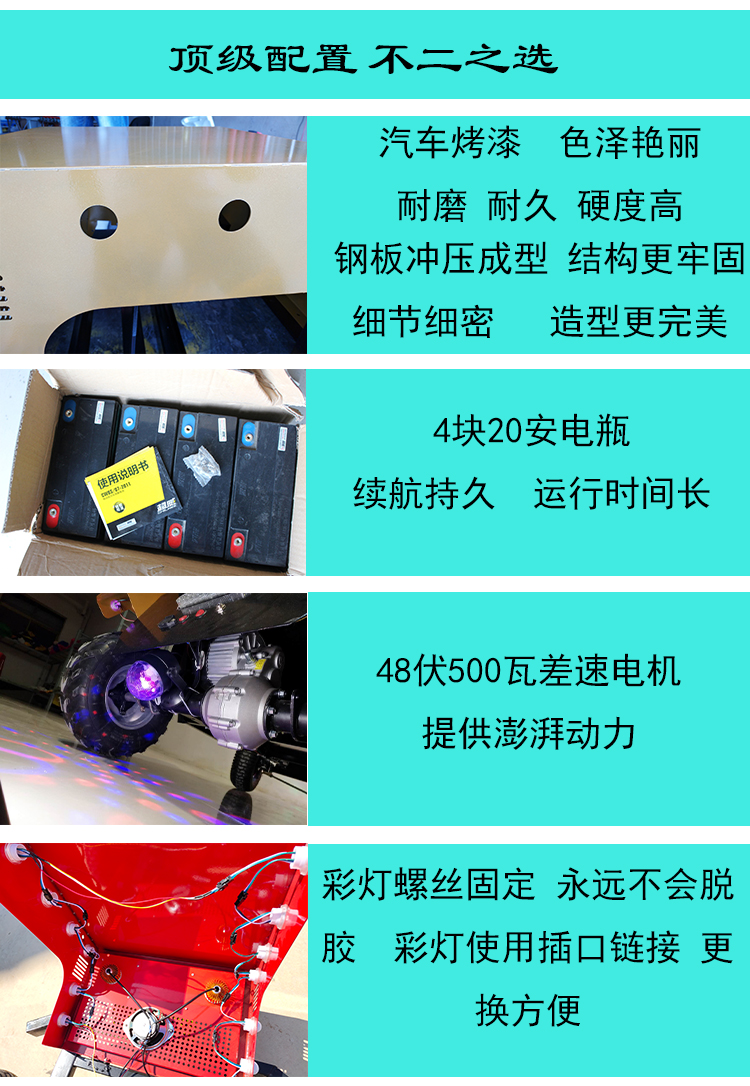 我記得我小的時候,沒見過這種廣場上的游樂車,更別說去做了,現在社會進步了, 廣場上的各種各樣的游樂設備無奇不有啊。小朋友都是喜歡那款車坐那款,不會看您誰是誰,所有做游樂設備的老板們要想做廣場生意,首先您的車子小朋友要喜歡,看上去就要做,一座上都不愿意下來,那樣您才能掙到錢,怎樣小朋友才會喜歡那?首先您的車子燈光效果要特別好,特別亮,您的車子小朋友才喜歡開。