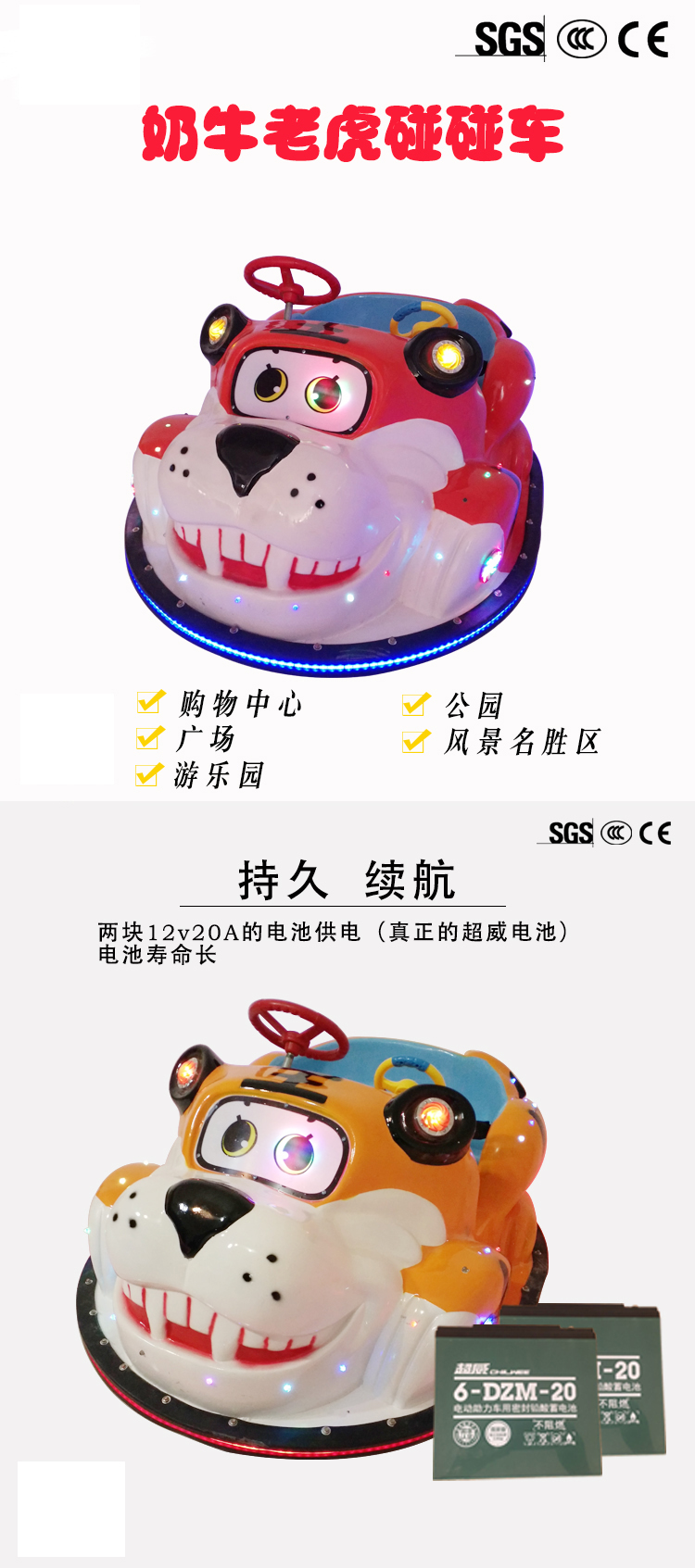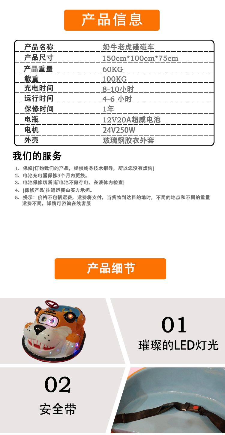 老虎奶牛碰碰車是公司推出的新款廣場(chǎng)玩具車,三代控制器,加裝防撞條,蘑菇燈版,造型可愛(ài),很吸引廣場(chǎng)小朋友,熱銷全國(guó)各地及海外市場(chǎng)。