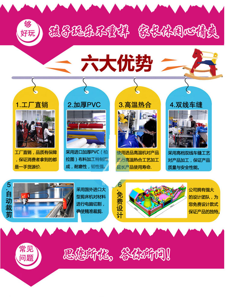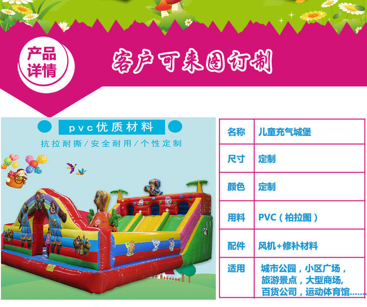 海倍游樂城堡事部專注城堡數(shù)十年如一日,有專門的設(shè)計(jì)和研發(fā)部門,有專門的城堡生產(chǎn)車間,接受來樣訂制,來圖設(shè)計(jì),可以根據(jù)您的場地大小長寬多少制作